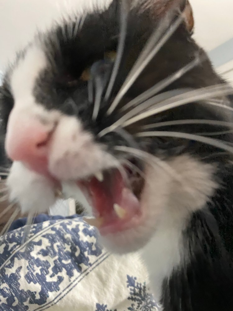 Nugget (Meatball) on the other hand, is exactly the cat I deserve. I like to imagine he is in his teenage stage (granted he is only two, but it is in fact, as they say, terrible). He is very “Mom, don’t touch my hair” all the time. I had this stage. My very own mother used to try and touch my hair all.the.time. Sometimes, this would escalate to violence. I suppose I can try and understand the sentiment here.