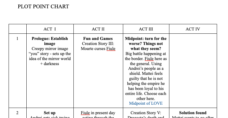 – I like to organize this into a chart (you can see a little preview of the one I used for my untitled novel in the featured image). The reason this type of chart works for me, is that each of the events lends itself to a chapter. I can mark off rising tension, midpoint, dark night of the soul, resolutions to make sure I am hitting all of the beats – and I can set it up so that I hit both external and internal beats.